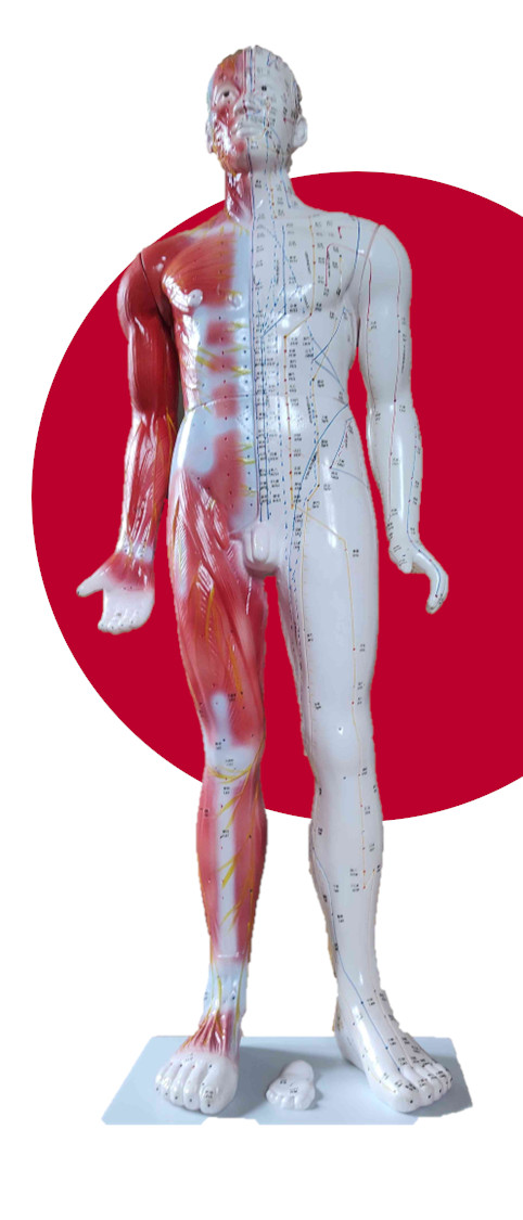 Auf diesem Modell sind die 12 Hauptmeridianen und zwei außerordentlichen Meridianen abgebildet. Darauf befinden sich insgesamt 361 Akupunkturpunkte.
